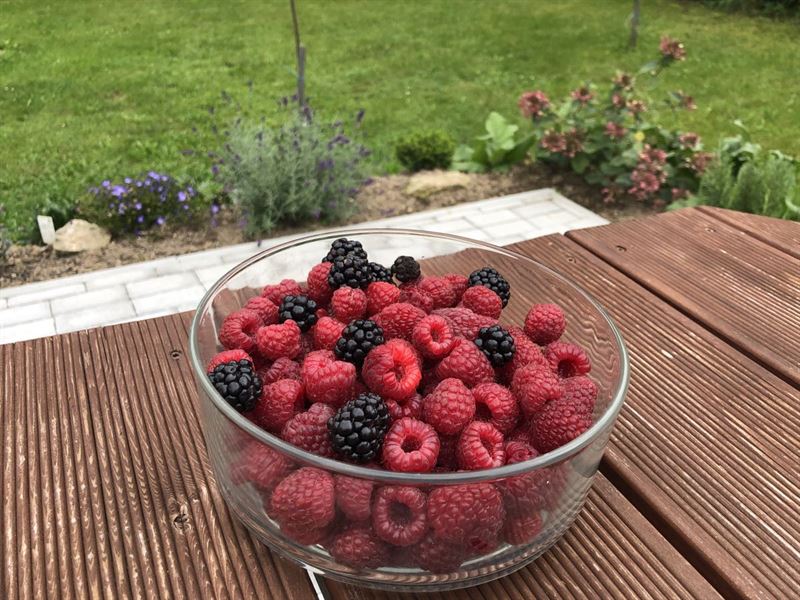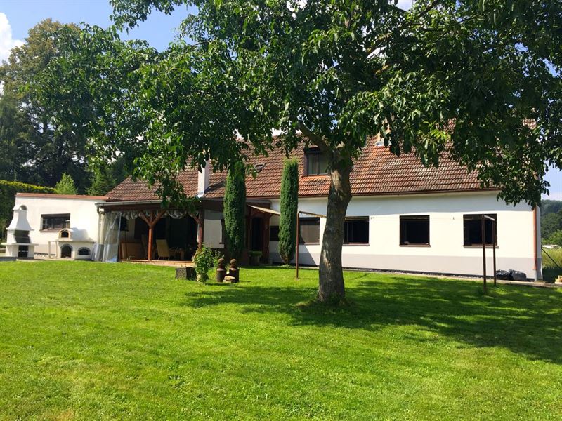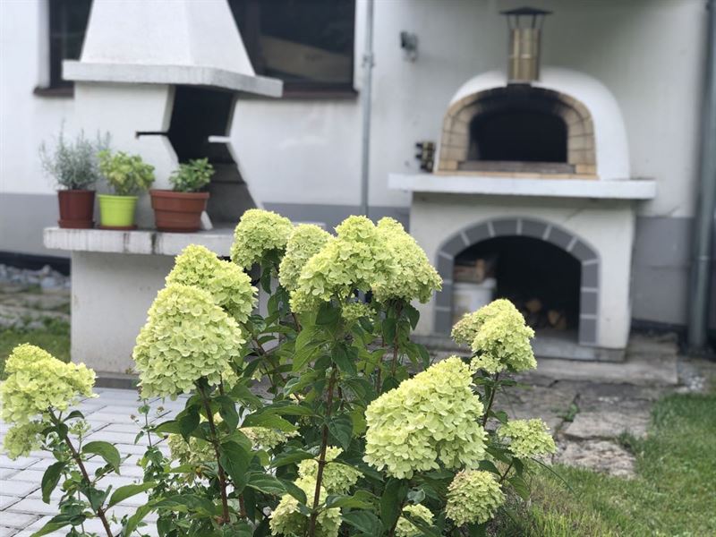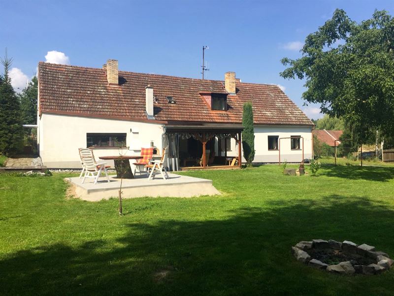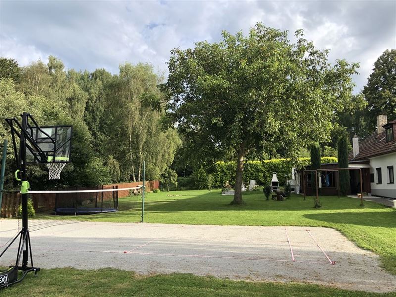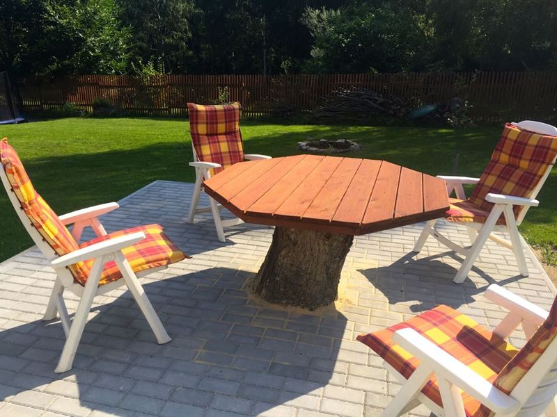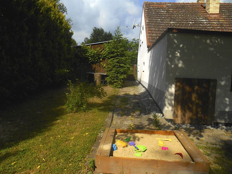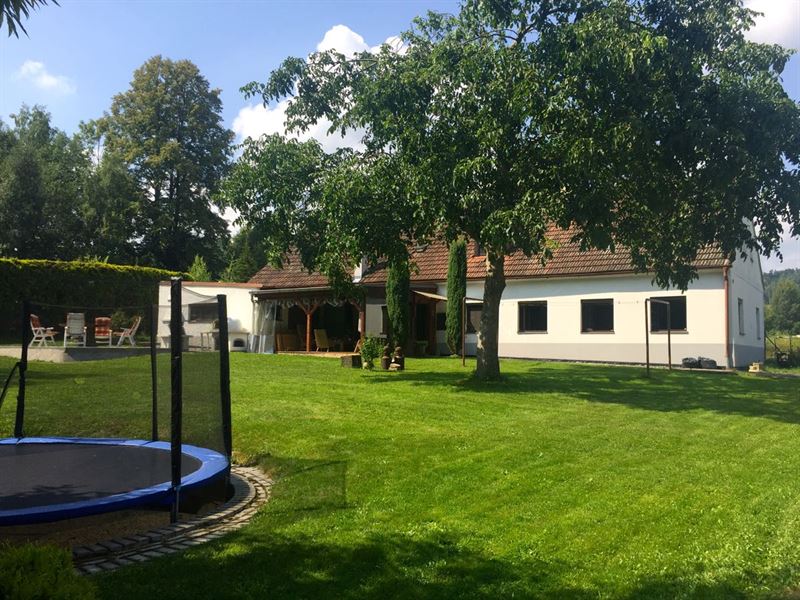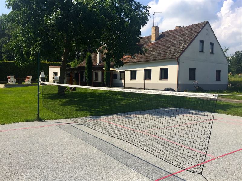 Na zahradě je vám k dispozici venkovní sezení se stolem (+ slunečník), pískoviště pro děti, trampolína s ochrannou sítí (průměr 4,2 m), polohovatelný basketový koš, vydlážděný plácek na pinec (stůl najdete v garáži), volejbalovo-badmintonové hřiště (lajny a síť standardně připravené na badminton + pravidla), venkovní pizza pec (lopata + recept na těsto), venkovní gril, ohniště (potřeby na grilování a opékání), kůlna se dřevem a různými proprietami, vrtaná studnu se zajištěným betonový poklopem, zeleň a stromy.
