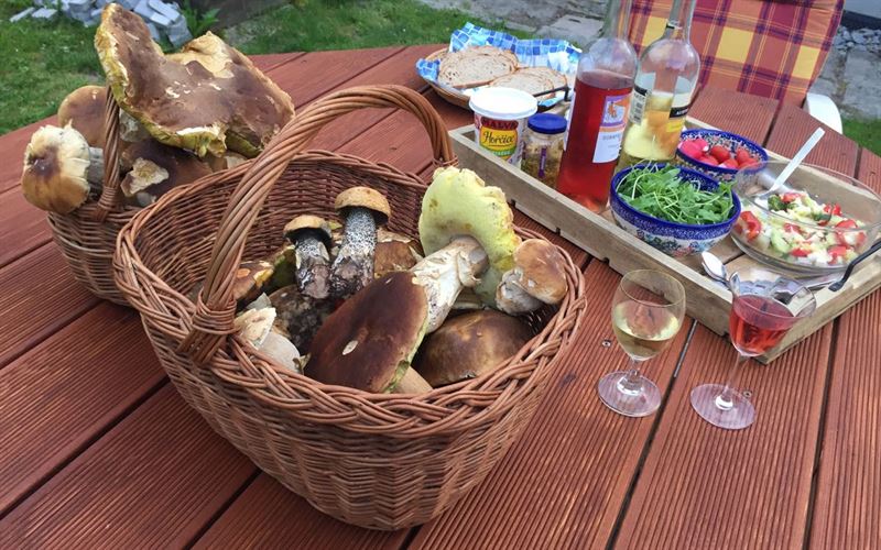 V garáži: sportovní výbava (viz výše), grilovací výbava (náčiní, držáky na ryby), velký slunečník s podstavcem (stahovat při odchodu)+ malé slunečníky, nářadí řemeslnické (plechová skříň), nářadí zahradní a sekery, hadice (např. napuštění bazénku), elektronické šipky (viz šrouby na zavěšení zvenku garáže)